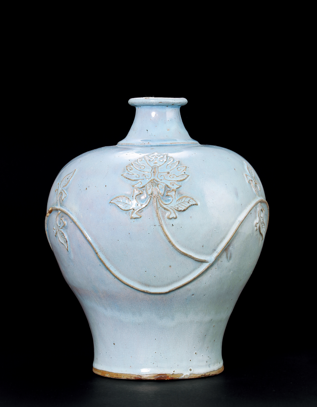 明末清初 宜钧釉紫砂胎浮雕花卉纹梅瓶