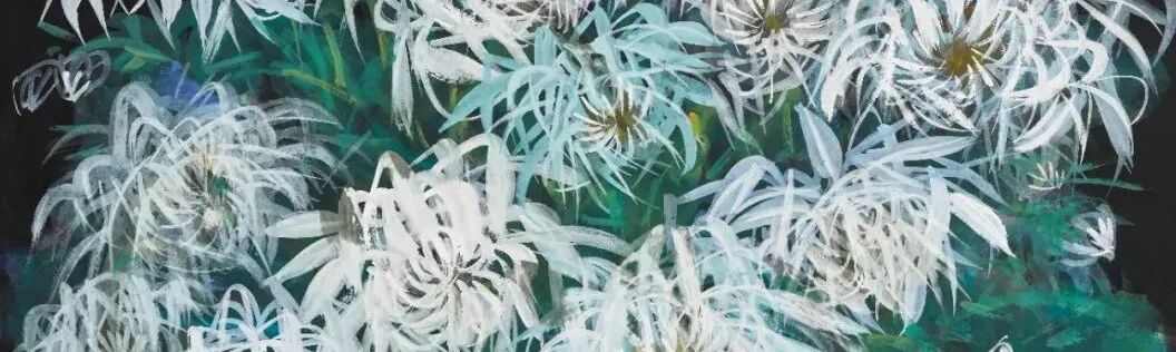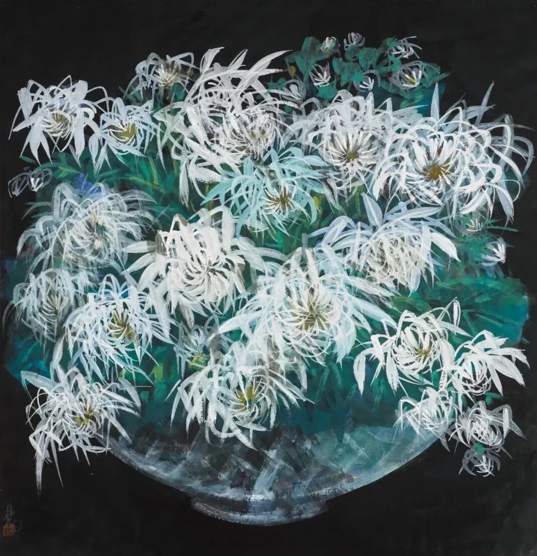 1964年1月,Gundersen 转往美国新奥尔良出任该地挪威领事。1968年先生与世长辞,其林风眠画作珍藏跟随后人回到挪威,自此陈列于夫人家中客厅至1986年,之后由家族珍藏。林风眠传统中国书画技巧根基深厚,早年远赴法国第戎美术学院修习欧洲艺术,崭露头角,1922及1923年于著名的秋季沙龙展出作品。林风眠返回中国后,艺术风格继续演变,以鲜明的色调以及大胆明快的笔触,将东西艺术风格揉合自成新风。具象静物作品《菊花》乃艺术家内心情感之表现,巧妙运用墨水与颜料在宣纸上之独特品质。画中花瓣呈白色及淡绿松石色,每朵花的内部涂成黄色,而花间叶子则为浅绿,为整体画面增添温暖及色彩。林风眠并置花瓶于画面中央,观者视线从中心外移,盛开花朵和绿叶四面映入眼帘,邀请观者欣赏菊花盛放之全貌。菊花描绘精细,黑色背景下花瓶倒影形成了多层阴影,营造鲜明而不规则之色彩对比,让菊花更添亮泽。![]()
