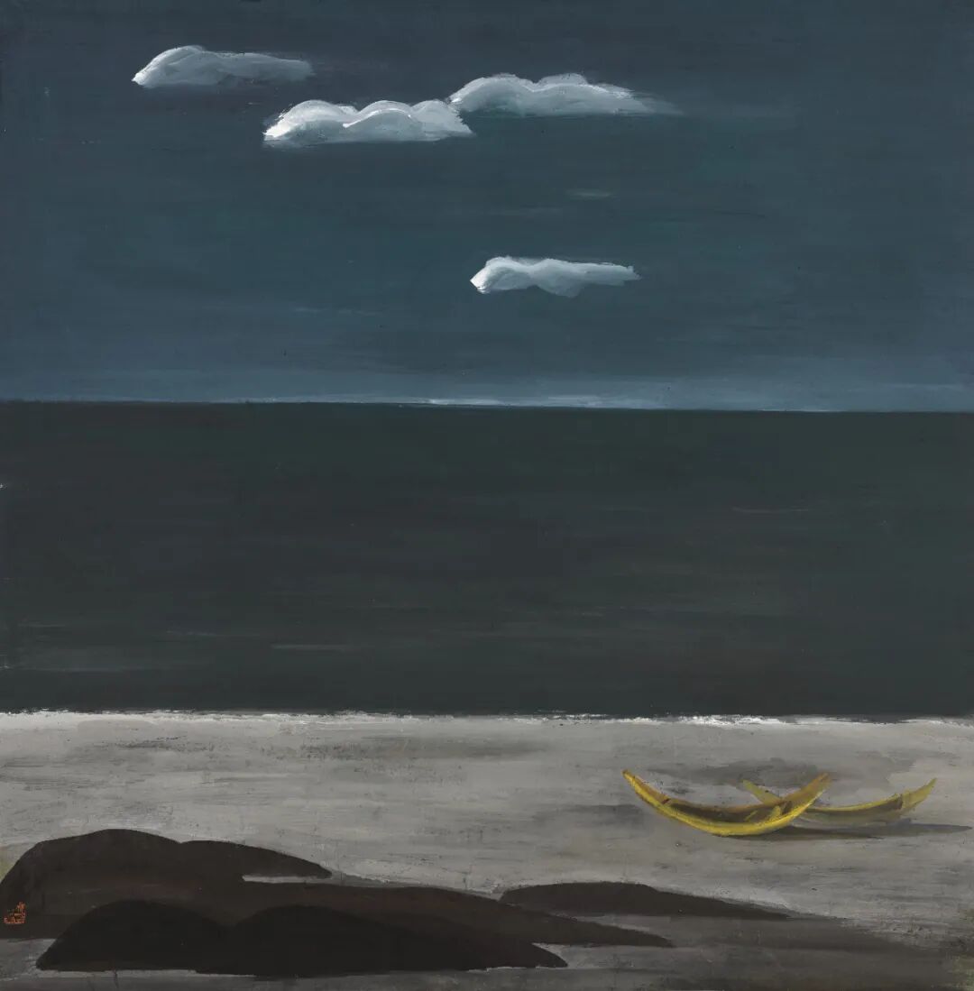 《海边》乃顾德逊收藏当中最独特之林风眠作品,艺术家以实色平面将场景划分为天、海、岸三部份,以深沉色彩营造紧迫感,整体颜色深沉不安,黄色船只乃全画当中唯一之鲜明色彩。构图并未提供任何解释或叙述,与一般观者寻求全面视觉及叙事内容之意愿背道而驰,反而任由观者自行摸索,寻找背后蛛丝马迹。雷内马格利特和乔治德基里科等超现实主义作品背景看似杂乱无章、超乎现实,让观者难以在画中寻找解释,从此方面来说,本作亦带西方超现实主义风格,颇具异曲同工之妙。林风眠 (1900-1991) 《海边》