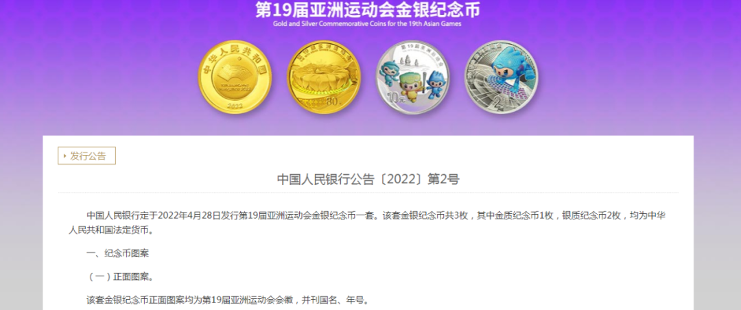 根据央行最新发行公告:定于4月28日发行19届亚运会纪念币!