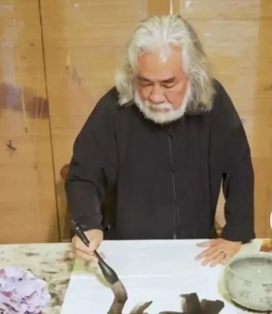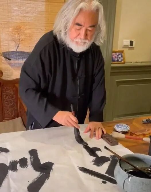 我们来还原一下当时场景,张纪中挽了挽衣袖,轻捋大胡子,手拿毛笔的姿势非常有大家风范,乍看起来,还真像是一位书法大师。