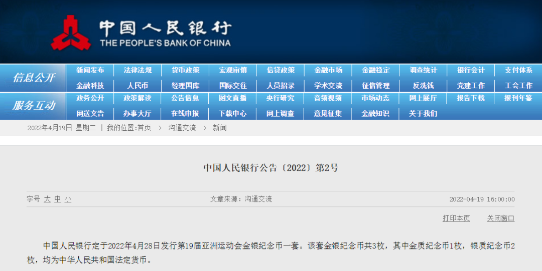 中国人民银行公告,将于4月28日发行亚运会纪念币一套,包括5克金币,30克银币,以及一枚5克2面值小银币。