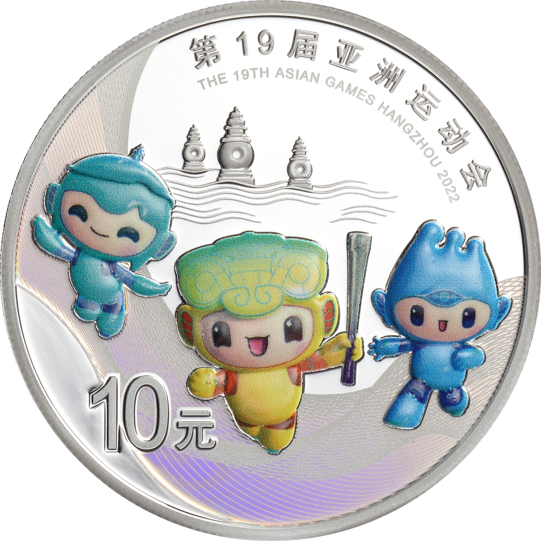两枚银币则都采用了彩印工艺,30克银上是本届亚运会的吉祥物“江南忆”,这3个机器人,分别为“琮琮”“莲莲”“宸宸”,彩色的设计更符合机器人浓厚的科技感和时代活力。
