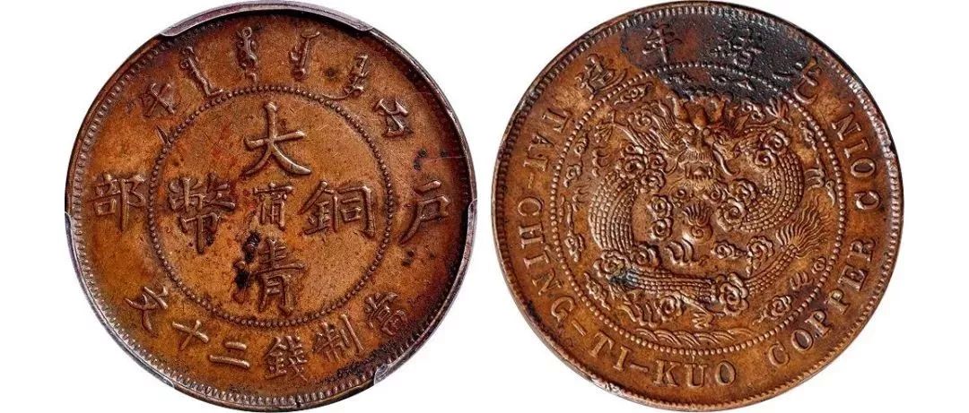 “大清铜币”系列新式铜元,其除十文币大量发行外,其余各等面值,均未量产,传世极稀。光绪年造丙午户部中心“宁”当制钱二十文铜圆,是极稀品,具有作为中国铜元纲要级大珍品的显赫地位。