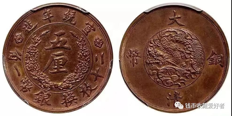 红铜质,薄版,铸造精美,带有原铸铜光,保存完美无瑕;此品种所见甚少,是为四川铜元大珍,完全未使用品。