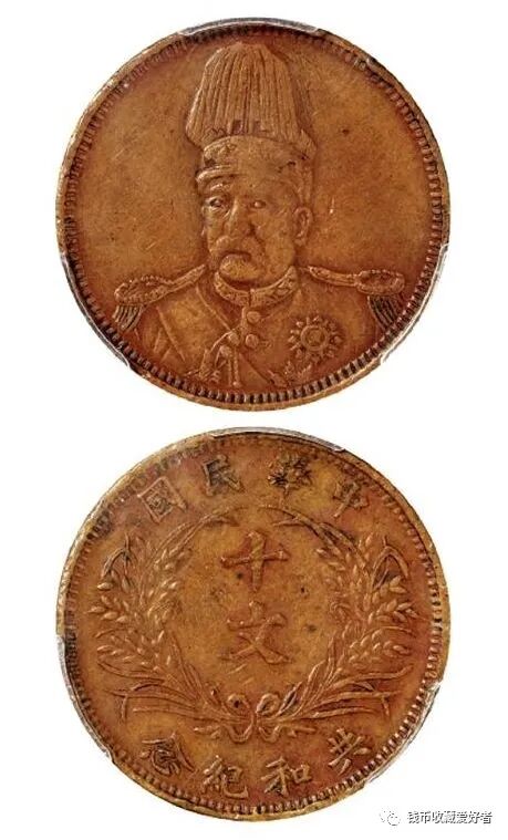 1912年袁世凯像背嘉禾共和纪念十文铜币,小面像版,武昌造币厂铸造,朱子芳雕刻,铸额极稀,发行量甚少。