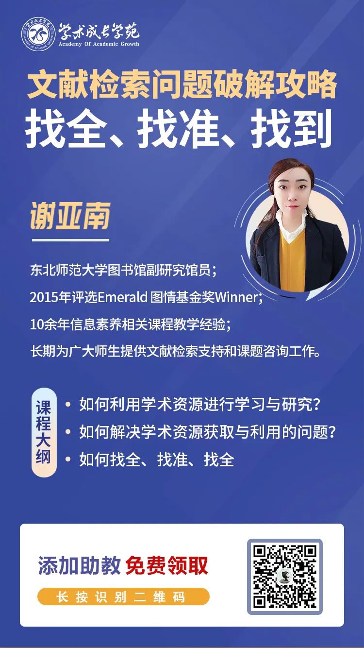 3. 忽视网络免费资源,不注意本专业领域免费网络资源的收集。为此,学术成长学苑特别邀请到东北师范大学图书馆副研究馆员谢亚南老师,为大家带来《文献检索问题破解攻略:找全、找准、找到》主题课程。此次课程谢老师将通过实例,帮助大家分析文献检索中找不全、找不准、找不到的原因,探寻检索问题的破解方法,使研究人员掌握文献检索策略以及基本操作,助力科研效率提升。谢亚南,东北师范大学图书馆副研究馆员。10余年信息素养相关课程教学经验,长期为广大师生提供文献检索支持和课题咨询工作,2015年评选Emerald 图情基金奖Winner。开设课程有《学术研究与文献》、《文献阅读》等。![]()