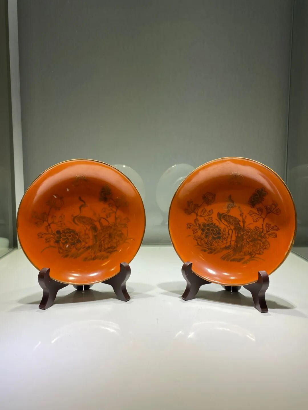 拍品第四件 清代 珊瑚红地描金孔雀纹盘(一对 )