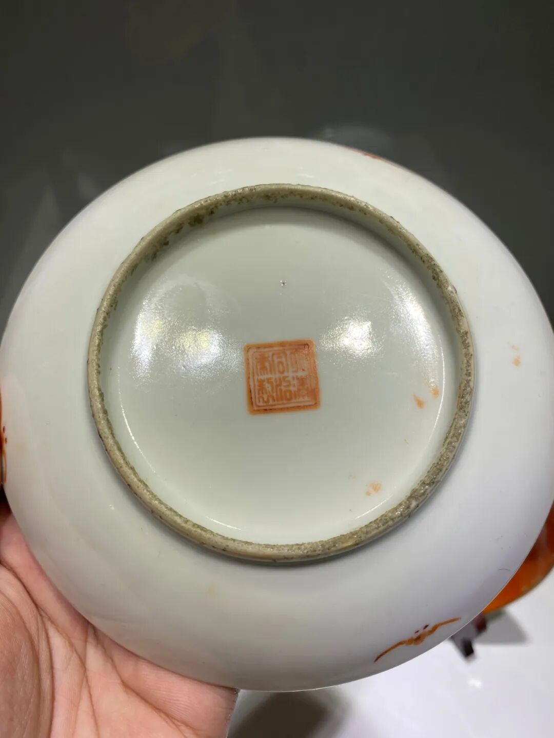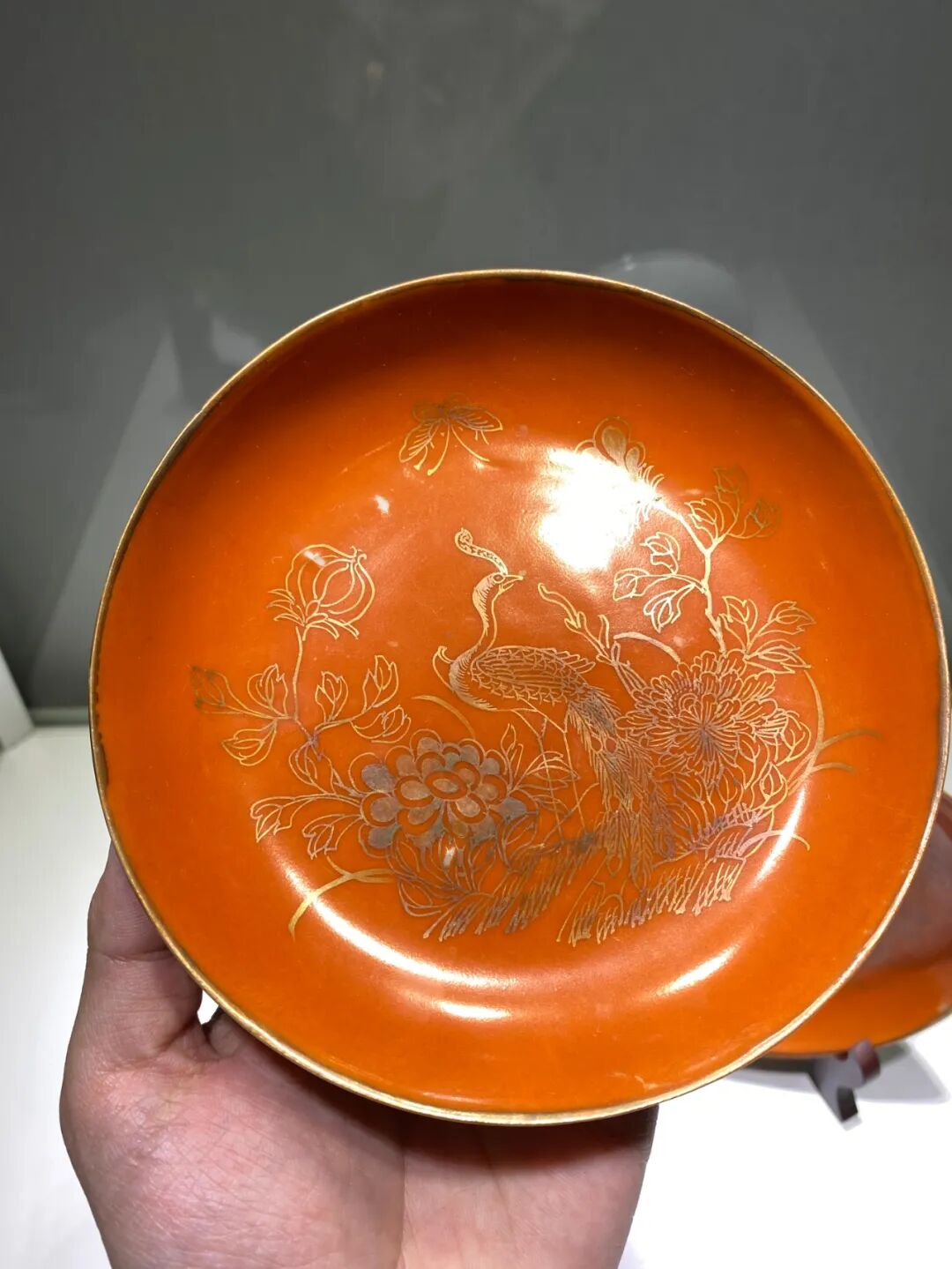 说明:盘内以珊瑚红釉为地,其上以描金绘孔雀纹饰,金光灿灿,光彩照人,色泽绚丽,金碧辉煌。整器胎质细腻,形制规范,底款“大清同治年制”,颇为别致,纯净莹润的珊瑚红釉色与鲜艳的金彩搭配,相映成辉。