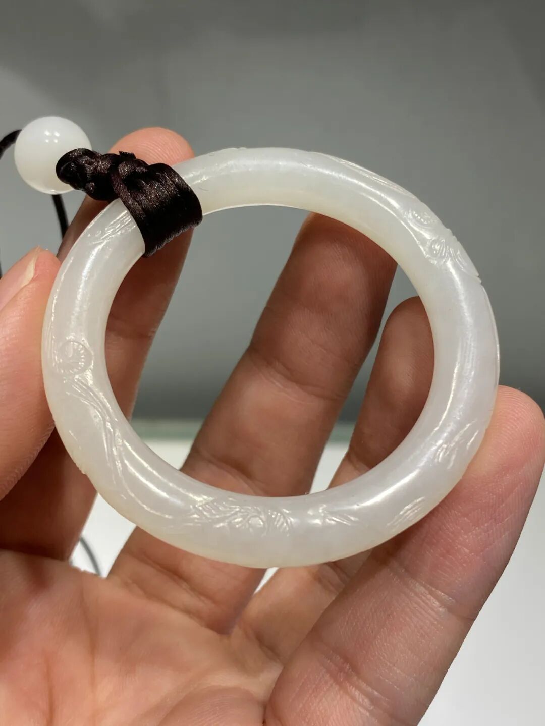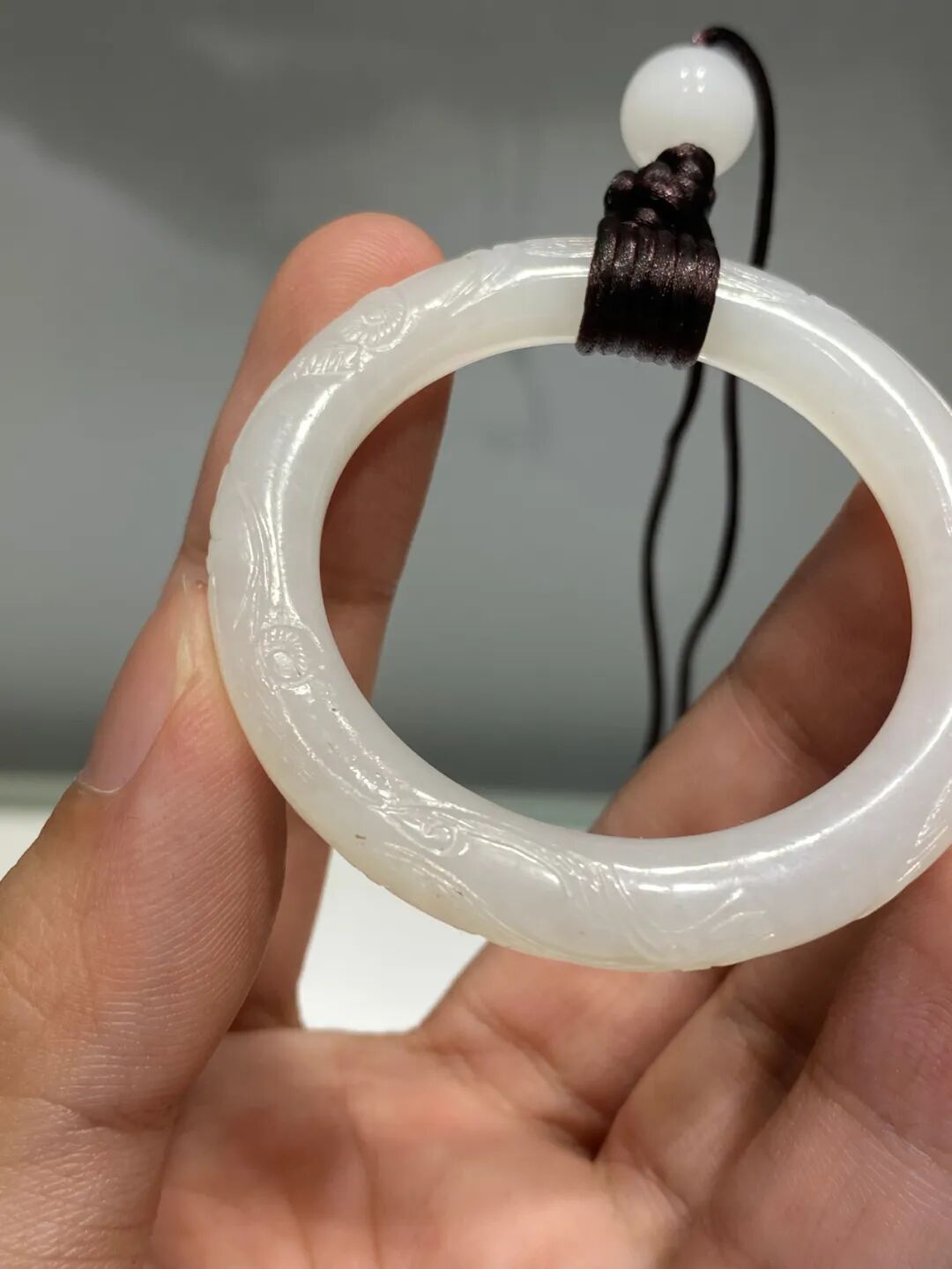 说明:玉质细白温润,环装,外圈雕一只头尾相连的环形螭龙,内圈无纹,抛光尚佳。袈裟环多见光素无纹者,此器纹饰精美,工艺精湛,殊为难得。来源:国有文物公司旧藏