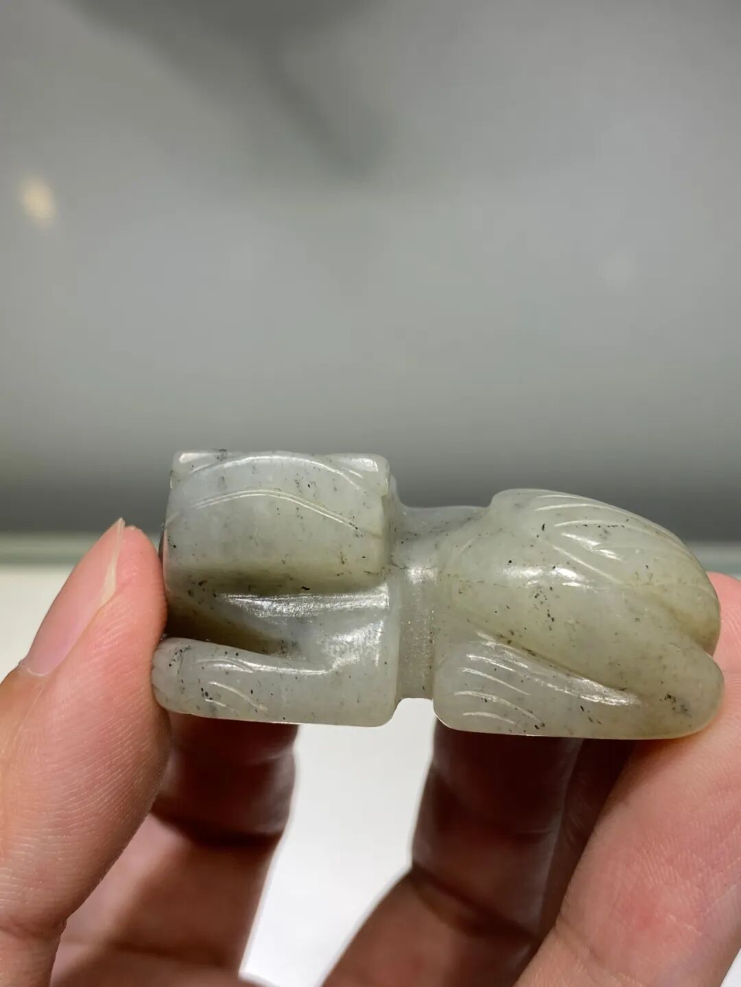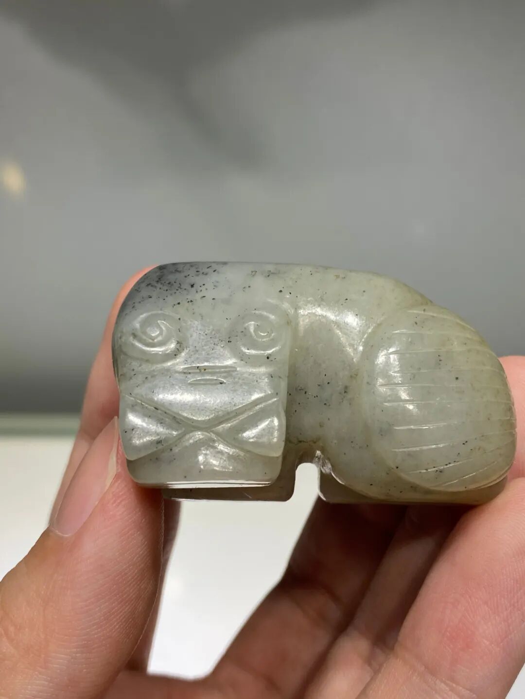 说明:瑞兽为细润的和田青花料质,光气十足。造型敦厚,呈侧首的伏卧姿态,雕刻精细、飘逸洒脱,大小盈手适宜把玩,放置案头瞬增凝瑞祥和之气,为藏赏皆宜之佳品。