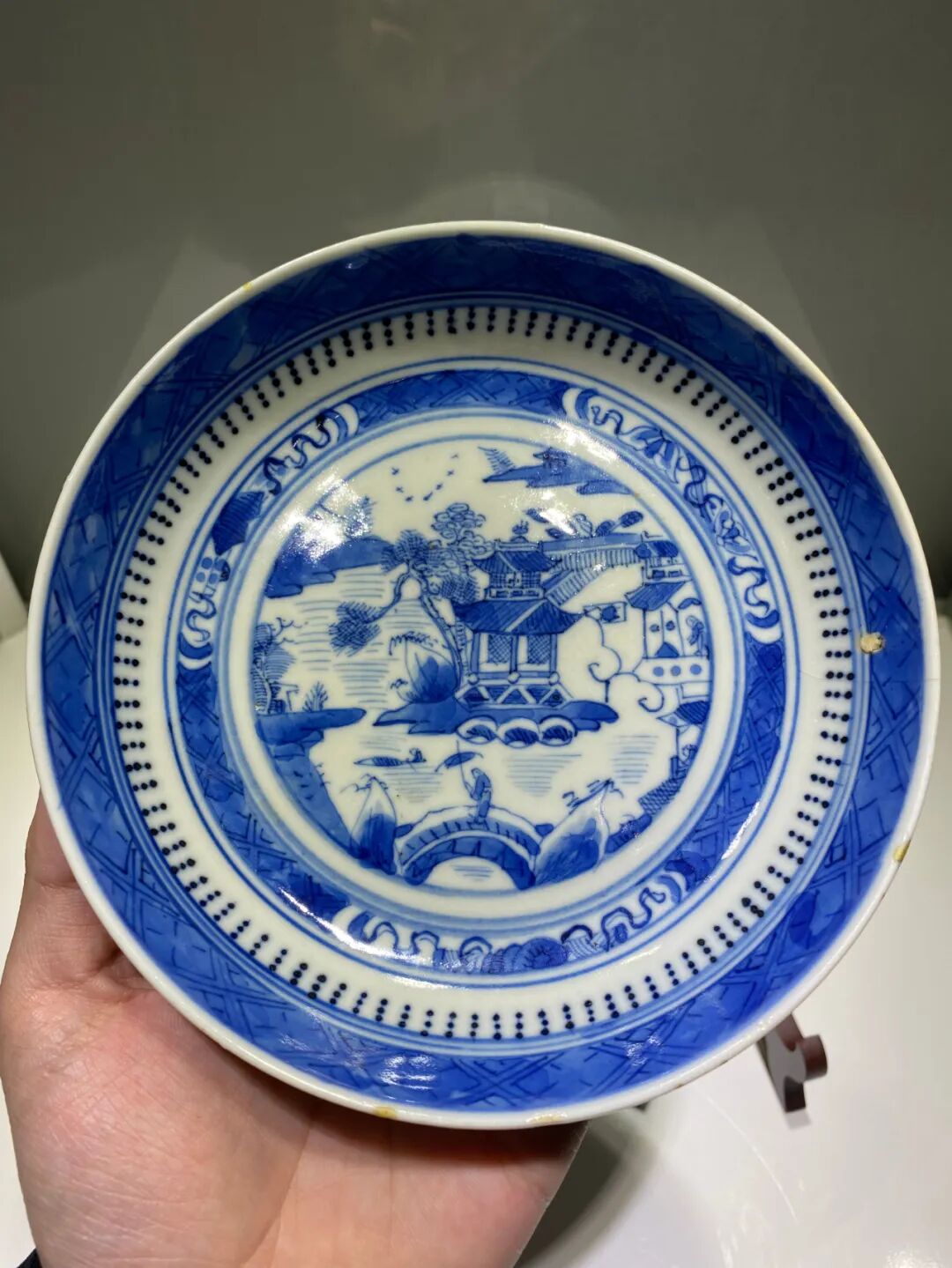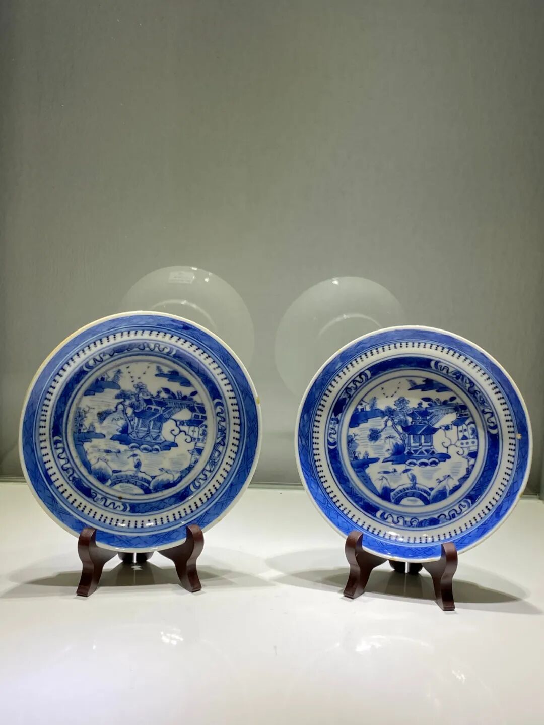 拍品第八件 清乾隆 青花山水楼阁图纹盘(一对)来源北京翰海拍卖会