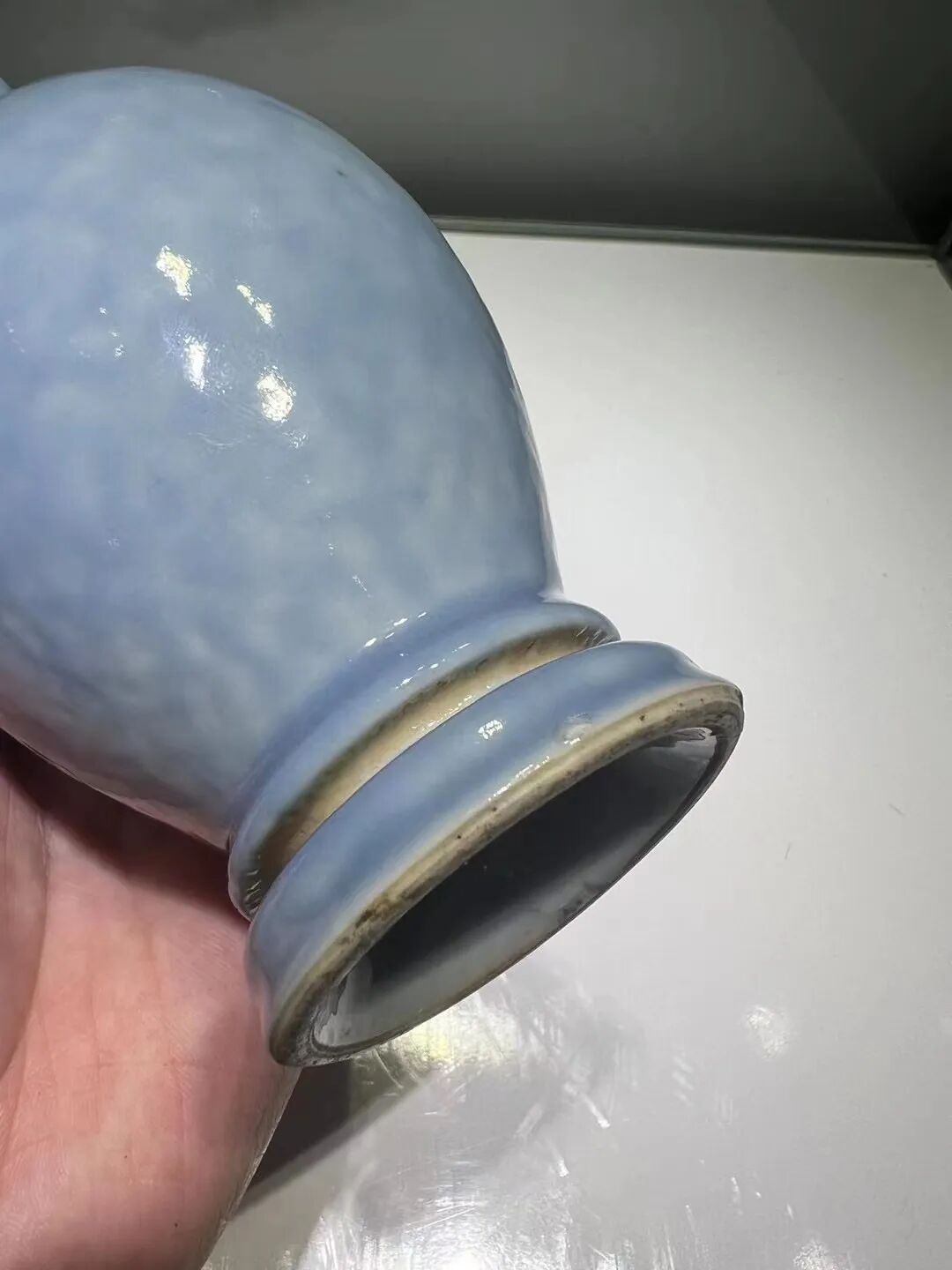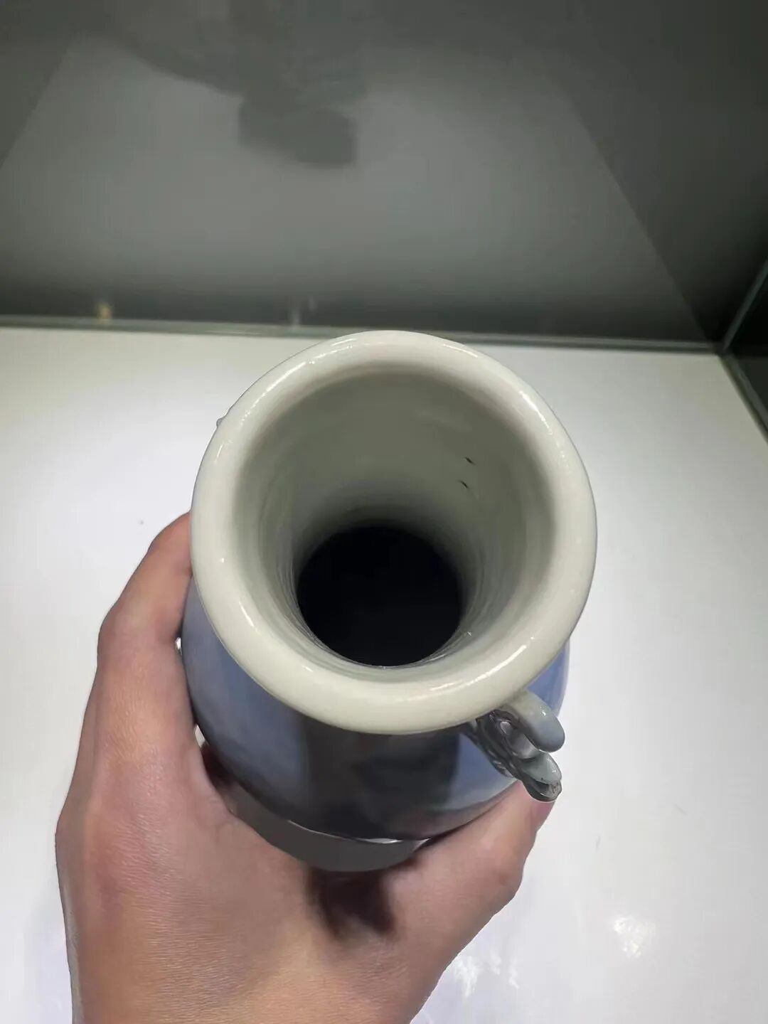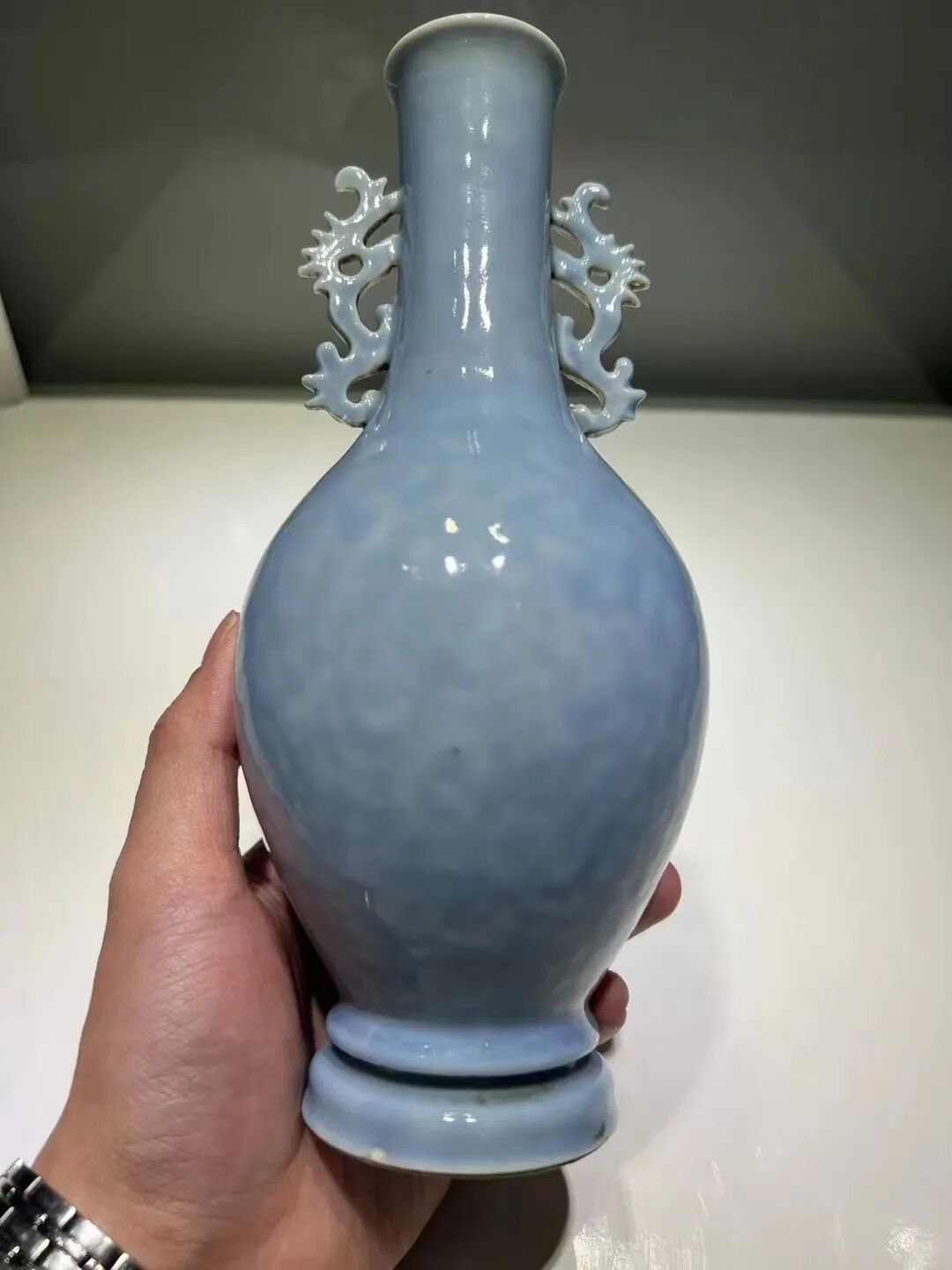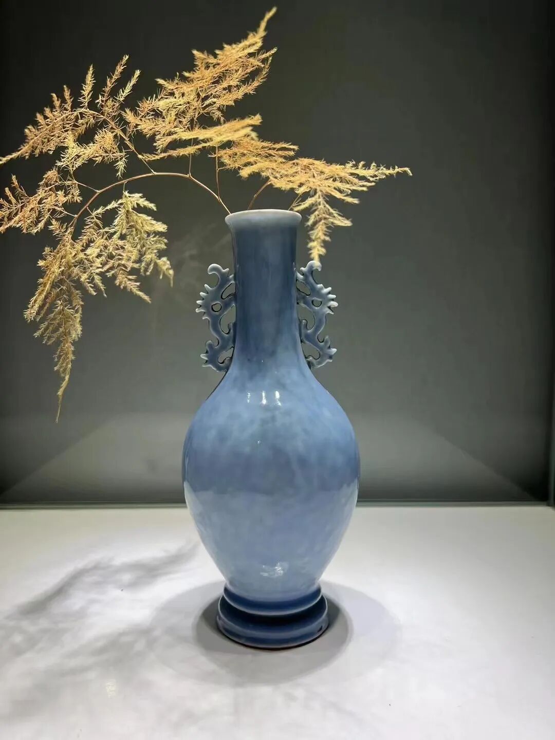 说明:长颈,双龙耳,通体施天蓝釉,底款“大清乾隆年制”,釉面细腻凝润,色泽沉然静谧,观之心旷神怡,气韵清雅。