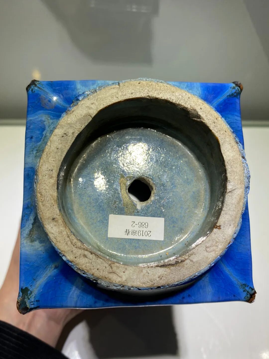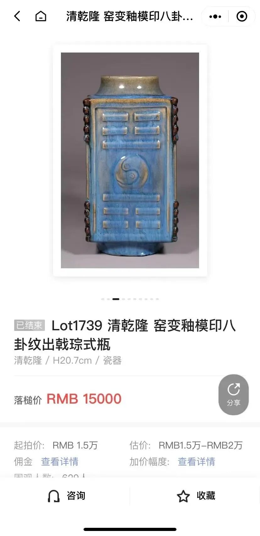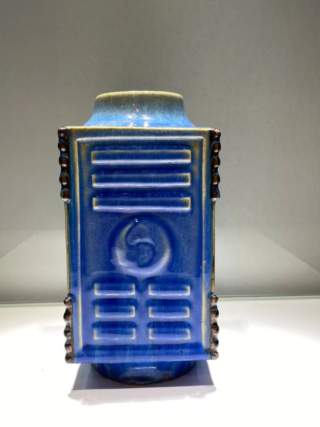 说明:拍品圆口、短颈平折肩,四方体,圈足。拍品通体施窑变釉,瓶身四角模印长短交替的横向凸纹,中心模印阴阳太极图,造型古朴而典雅。这种瓶式系仿周代玉琮外型并加以变化而成,清代亦将道教意义上的八卦纹饰于其身,体现了“天人合一”的理念。参考市场价1.5万
