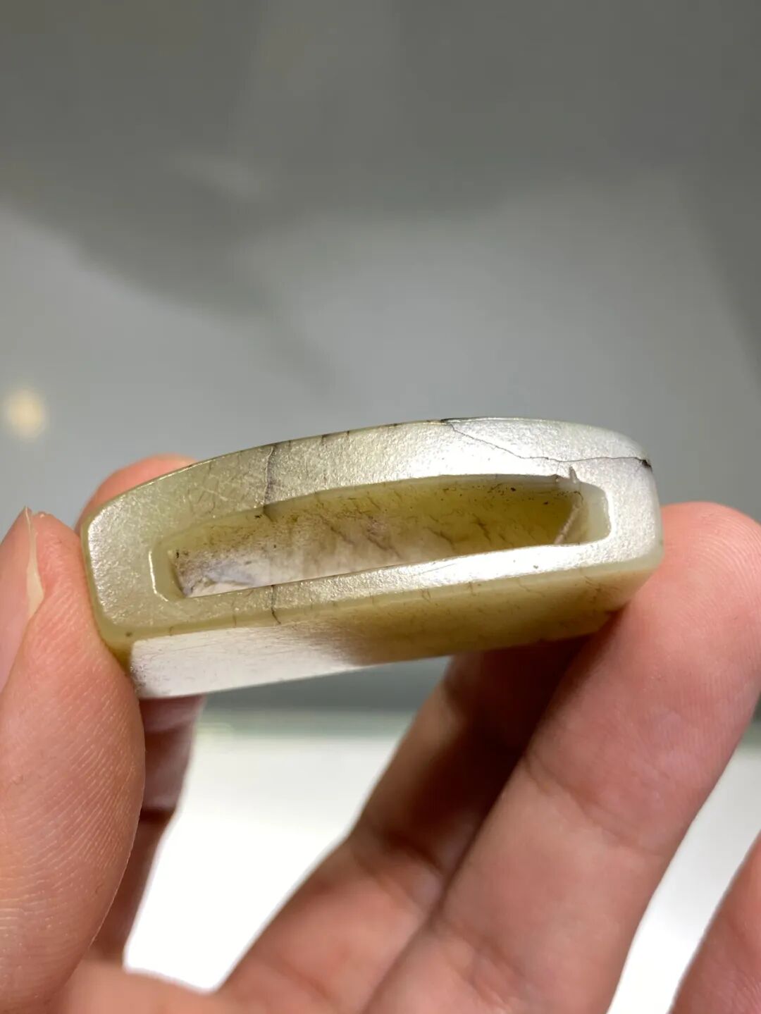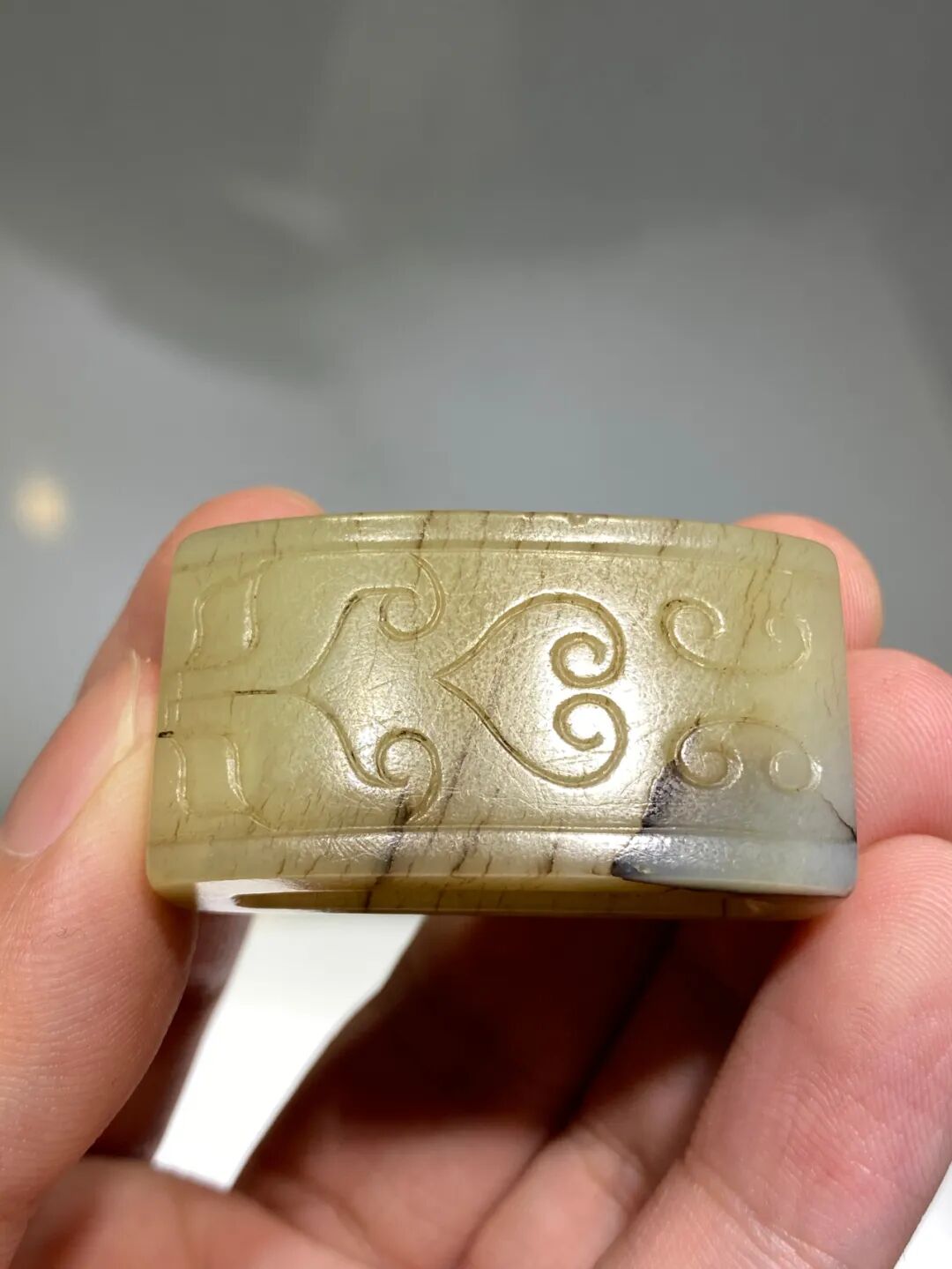 说明:扳指是辅助射箭的工具,戴于拇指,正下方有一个槽,用来扣住弓弦以便拉箭,作用是防止放箭时,急速回抽的弓弦擦伤手指。因功能类似扳机,故又称为“机”。扳指前身为“韘”,据《说文·韦部》载:“韘,射决也。所以拘弦。以象骨。韦系,箸右巨指。”