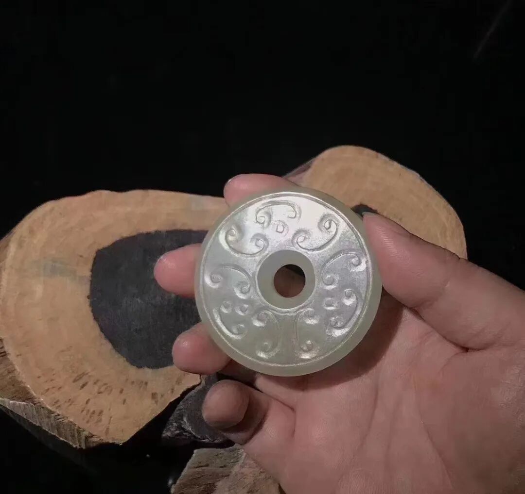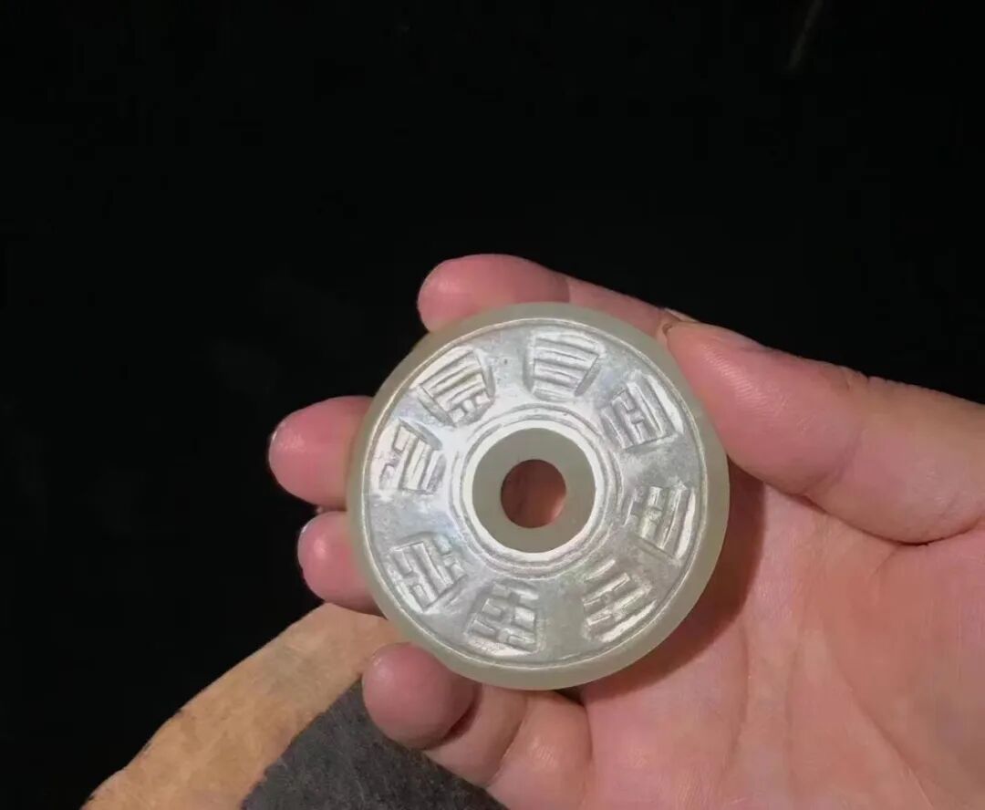简介:《尔雅·释器》载:“肉倍好谓之璧”。好即是玉璧中心的开孔,肉即为璧体。此玉璧以和田玉制成,玉璧纹饰分正反两面,正面“肉”上圈雕刻云纹,采用阴线刻作纹,线条琢刻流畅,刚劲有力。另一面“肉”上圈雕刻八卦符号,雕作精细,图案工整。该玉璧质地较佳,琢刻质朴,颇得古意。是晚清时期一件寓意为吉祥之玉璧,具有较高收藏价值。