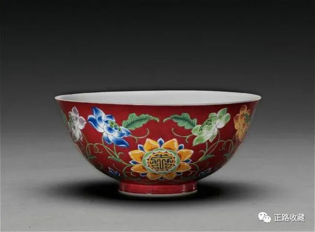 清康熙胭脂红地珐琅彩莲花团寿纹碗 北京故宫博物院藏