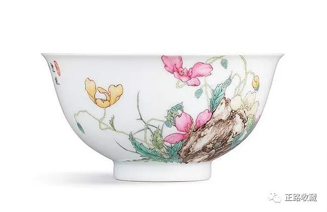 此盌器形雅正,弧壁浑圆略撇,胎质细密,均净如雪。从景德镇御窑跋涉上送京师,宫中妙画珐琅彩,外壁写生虞美人,黄自矜持、白怯羞绯、红恃娇纵、紫尚雅风,翠叶间,纤花或含蕾、或盛绽,曲茎摇曳微风中,石半掩、蝶萦绕,渲染描绘细腻如生。