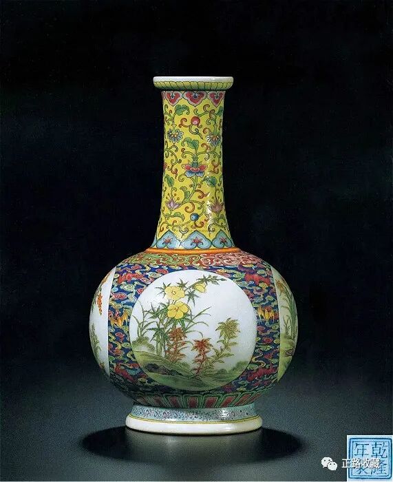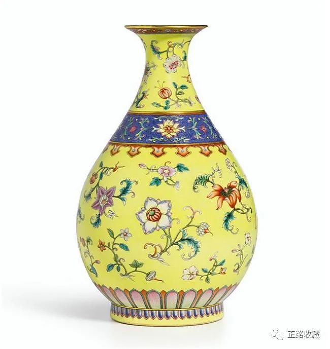 清乾隆 黄地洋彩轧道锦地折枝洋花玉壶春瓶