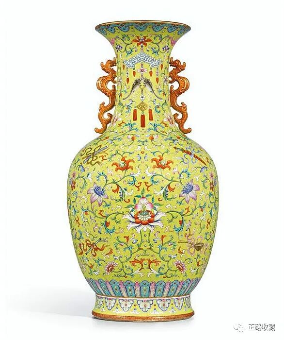 双龙耳瓶,以双螭龙为耳,细节处施以矾红描金。瓶外口及圈足外壁绘矾红金彩回纹装饰,不仅上下相合,亦于瓶颈左右两侧龙耳形成统一之视觉观感。瓶颈以黄釉地锥划凤尾形卷草锦纹,与瓶下胫部黄地洋彩西番莲纹为配,两种西番莲纹一纵一宽,配合器物局部造型而设,显示宫廷法度一丝不苟。