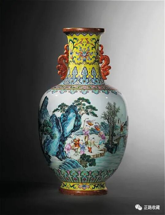 清乾隆 瓷胎洋彩黄地锦上添花莲纹长春百子图双龙耳瓶