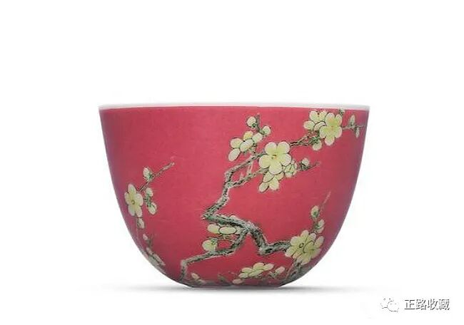 史上最贵之二十名 清雍正 珐琅彩胭脂红地梅竹纹酒圆 估价:HKD 40,000,000-50,000,000 成交价:HKD 40,860,000 佳士得香港2016年秋季拍卖会 成交日期:2016-11-30 尺寸:直径6.3cm