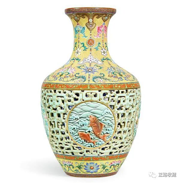 清乾隆 洋彩黄地粉青透龙夹层吉庆有余玲珑尊