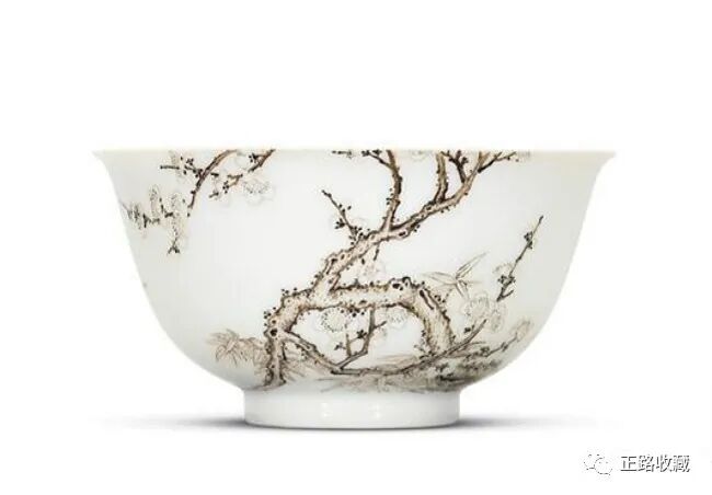 清雍正 珐琅彩赭墨梅竹图碗 蓝料双方框