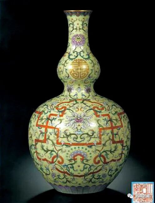 史上最贵之第一名 清乾隆 浅黄地洋彩锦上添花「万寿连延」图长颈葫芦瓶 估价:HKD 30,000,000-50,000,000 成交价:HKD 252,660,000 香港蘇富比2010秋季拍卖会 成交日期:2010-10-07 尺寸:40cm