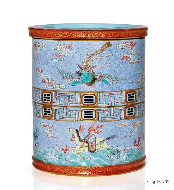 古人所用之物,皆附以美好寓意,清宫帝王之物更是言必有意,意必吉祥。此“清乾隆 御制洋彩 ‘江山一统’八卦玲珑旋转笔筒”便是如此。其为直筒型,制作工艺精巧绝伦,口、足边出,环壁形足。内施松石绿釉。筒身以天蓝色地绘蓝彩卷草纹成锦地,筒身上壁可旋转,绘以洋彩五色凤、凰二禽,并遍布祥云纹。腹部中央为上下两周小长方形开光,饰“万字不到头”以喻万寿无疆,并于描金开光内以墨彩书八卦卦象。筒身下半部绘龙马负图、灵龟两只、及六岳山石及海浪灵芝。外口、足边饰红彩描金纹饰。底施松石绿釉,落青花篆书“大清乾隆年制”款。