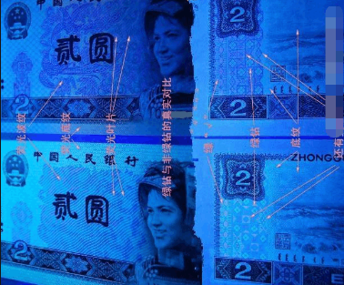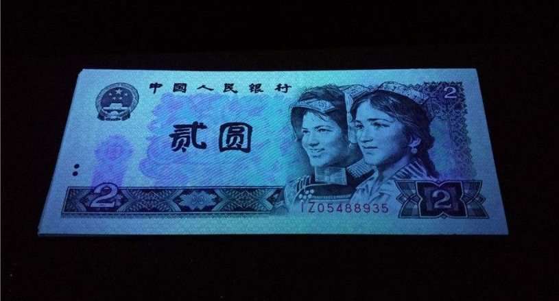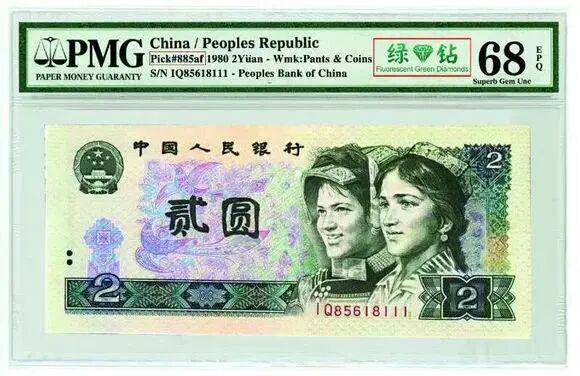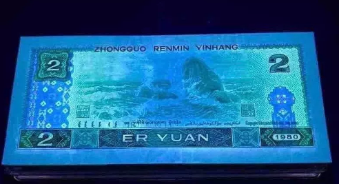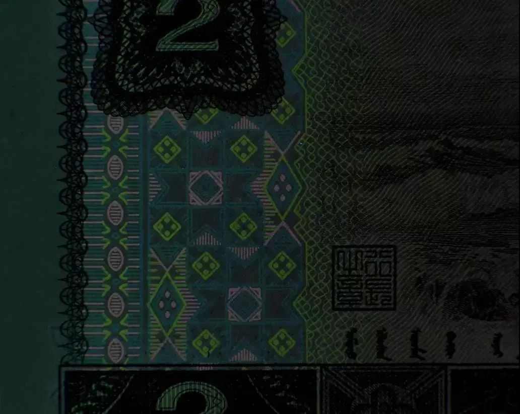 802绿钻是1980年版2元纸币的特殊荧光效果。绿钻之所以被称为绿钻,是因为在荧光的照射下,纸币正面绶鸟翠竹呈现绿色荧光,背面左边有很多组小钻石,会发出绿色荧光的“田”字图案,看上去像一粒粒钻石,“绿钻”由此得名。