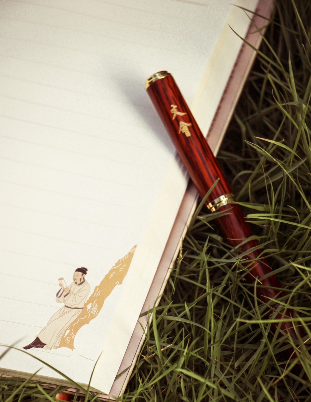 外包装盒和笔记本封面设计提取《佚名设色文会图轴》中的人物及溪水元素进行画面重构,倚着树看书的人物,表现古代文人之雅趣