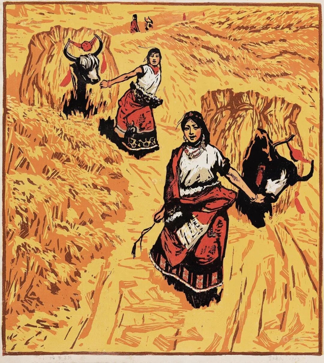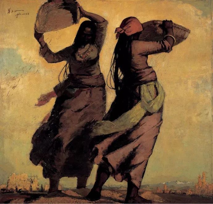 完成于1963年的《初踏黄金路》,反映的是西藏民主改革主题。“农奴们得到解放,有了自己的土地和生产资料,劳动起来也非常兴奋。秋收的时候,他们傍晚把粮食收回来堆到院子里,晚上就不停地唱歌跳舞,高兴得不想睡觉。当时我到西藏写生,半夜时经常被他们的歌声唤醒。”画面以象征着丰收的金黄色为主调,与其作对比的黑、白、红三色突出了欢乐自信的藏族妇女。画面线条饱满有力,恰到好处地表现了藏族人民喜迎和平解放后第一个丰收年的心情。