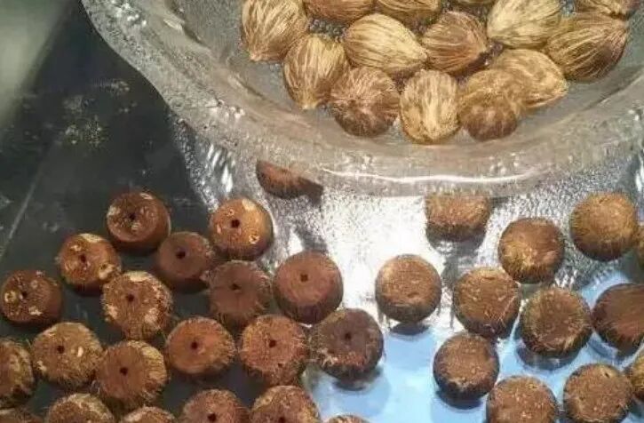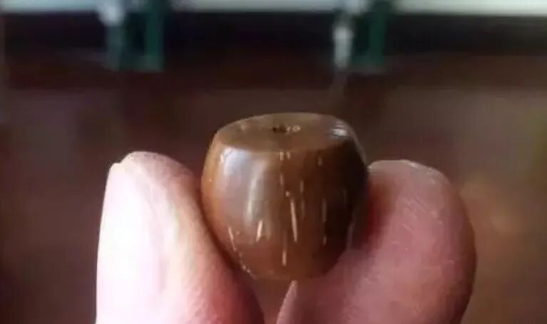 但是那会儿玩的人也不是特别多,紫金鼠真正火起来,还是在它扒掉“外衣”之后,车成光珠。紫金鼠的颜色大致有黄色、红色、深红、褐色、黑色等等,以褐色和红色为最多。紫金鼠喜油喜汗,不娇气,不怕裂,不怕脏,盘玩省心,变色又容易,能秒杀很多别的文玩。紫金鼠三个月盘玩变色就很明显,时间久了可以盘出漂亮的玻璃底,甚至让人误认为是小叶紫檀。不过就算变色很容易,想要盘出堪比小叶紫檀的效果,那也是要花很多心思的。随便玩玩,就还是有很明显的棕眼。紫金鼠虽然不怕脏,不怕汗,但是要想盘玩得漂亮,必须得注意手上的卫生,在盘玩的时候必须得净手盘,而且是净手盘和戴着手套交替进行。戴着手套盘,一是避免把紫金鼠弄脏,二是抛光。净手盘上三五天,再戴手套盘上一天,用手套抛光,增加紫金鼠的亮度,如此反复,坚持盘玩下去,就一定能把紫金鼠盘出玻璃底。既然紫金鼠这么好盘,趁着五一假期,不如自己打磨一串如何?想要将紫金鼠菩提做成桶珠,并不是所有的原籽都适合的,需要进行合理的挑选。建议选择大小、皮色都差不多的。鼠眼三个孔的高度位置是非常重要的,应该选择鼠眼比较低的原籽,这样在经过打磨之后不会轻易露出皮肉,珠子的外表形态能够得到很好的保证。选好籽之后就可以开工了,使用台钳将紫金鼠菩提固定住,直接使用木锉去皮即可。使用木锉的好处就是在打磨的时候可以边摸边看,若是直接切割的话很容易出现切割露肉的情况。