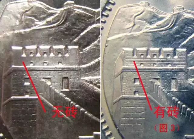 后期生产的长城币背面长城图案前面左侧城楼上方的箭楼部分,布满了砖的缝隙痕迹,凹入部分有国徽透打形成的彩虹状痕迹,无镜面效果;背面凹入部分,有轻微的片状铸造纹理。“无砖”、“有砖”两大特征的原因,主要是生产厂家对后期铸模进行了修正。因此,1980年有砖版也可说是壹圆长城币的定型版,而无砖版也可称为“试验版”或“错版”。