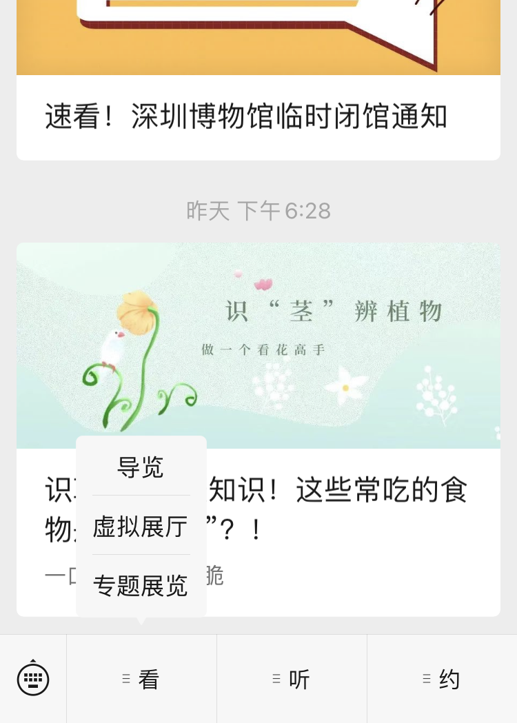 2.进入公众号底部菜单栏,点击“ 看”,点击“虚拟展厅”,选择“眼界”。