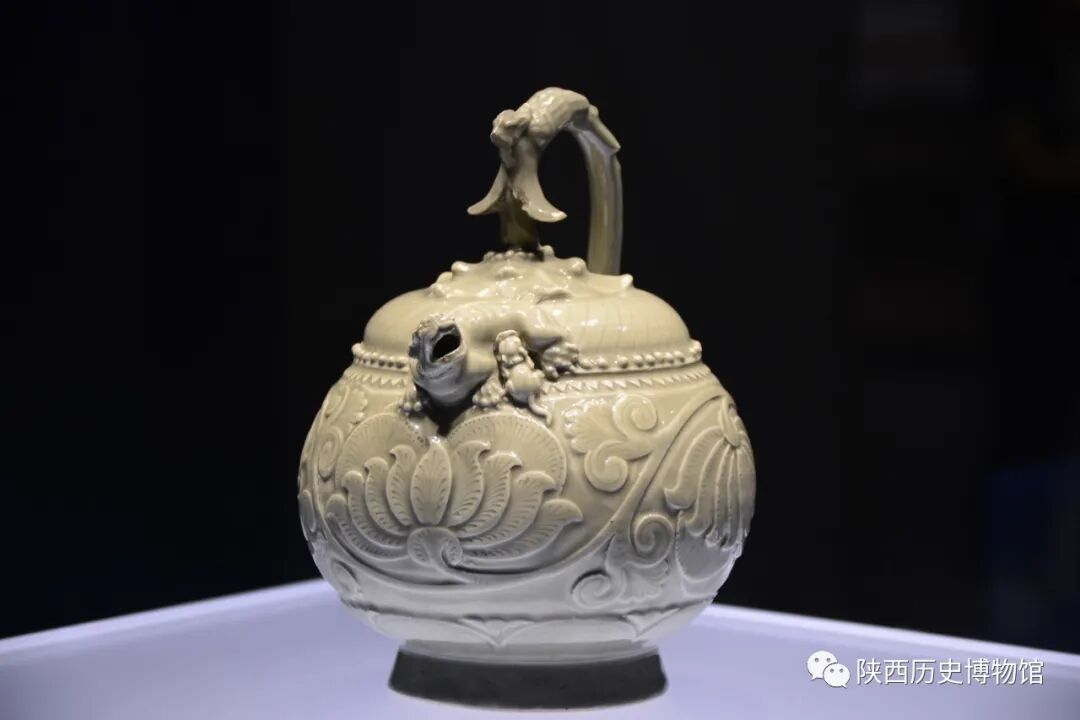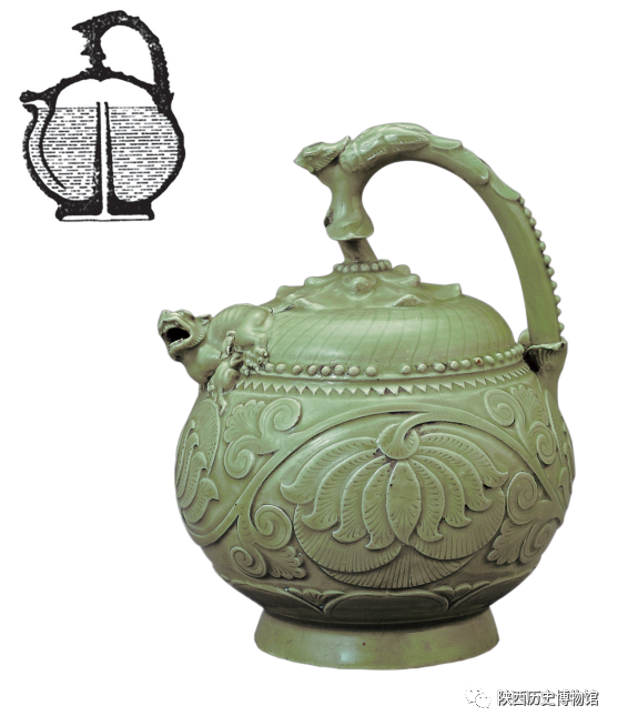 高18.3厘米,1968年于彬县出土。壶底中心有一五瓣梅花形孔,灌水时将壶倒置,水从母狮口外流时始盛满,因壶内有漏柱与水相隔,底虽有孔而不漏。该提梁倒灌壶的造型、结构极为奇特,纹饰繁缛华丽,是目前国内外耀州瓷器中甚为罕见的珍品。