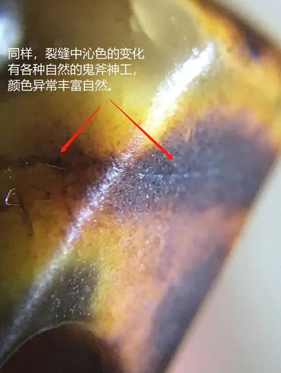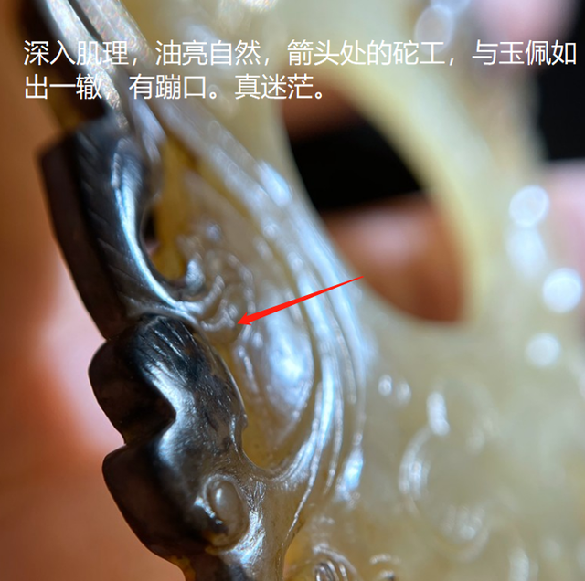我看到凡是重沁而不透的,或沁无门(裂),我都加倍小心。质变必色变(仿品也一样哦,是玉都这样),细心的发现,古玉重沁,其实还是通灵的,不那么“死”。另外,光气应该好。我都有点舍不得分享了!