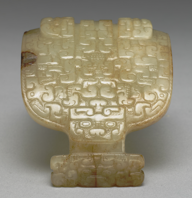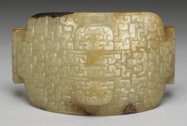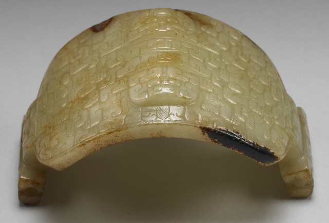臂搁玉白玉沁褐,水灵干净,局部有深色斑块。半环形,两侧类似T形插榫。边缘饰绞丝纹边棱,表面正中有上中下三块突起,上下雕相对的兽面纹,中央突起的两侧雕兽面纹,中央浮雕几何纹路为身体;主体两侧亦雕饰兽面纹,隙地浮雕几何纹路。侧面各有一通穿,背面光素。