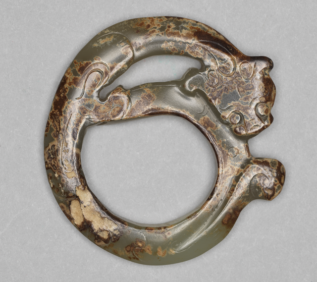 这是东汉的螭龙环,重沁,光气,您品。重沁,玉消融,形成膜样浆光,比如黑漆古,我有个黑漆古琮,商或齐家的。