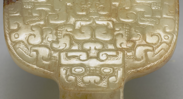 美学:从西周所倡导的礼制到春秋,历经300多年,形成了春秋独特的玉器表现方式,有庙堂气,规整,严谨,繁复,精细。西周早期沿袭商代制玉方式,一面坡,双阴挤阳。春秋最有特色的是不减地浮雕。此件所表现出来的美学特色,即不减地浮雕风格。纹饰对称,严谨,静穆的庙堂之气,与汉代纹饰天马行空的张力,迥然。