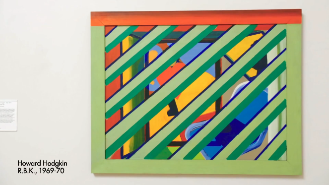 霍华德·霍奇金描画了他的好朋友RB·基塔伊,画中人坐在窗边看风景,贯穿画幅的倾斜绿色带将观众与画中人物分割开,所表现的似乎是被困于室内与他人分隔的处境。