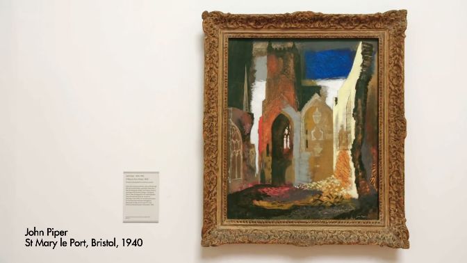 1940年,纳粹空袭布里斯托,炸毁了中世纪的港口圣母教堂,约翰·派博开车前去画下了教堂的废墟;在许多人认为英国正处于战败崩溃的边缘时,保罗·纳什画下了《死海》,纳粹破损的飞机构件组成的海洋映照出了一片荒芜。