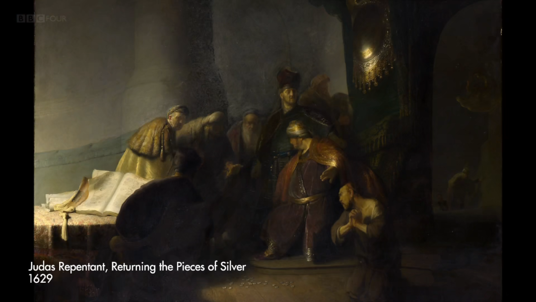在画布未干时,用笔刷的尖端勾勒出头发的卷曲;卖眼镜的场景中,对一位顾客的酒糟鼻进行细致入微的刻画;犹大归还了背叛基督收到的银币,整个场景明暗交杂,圣经、盾牌、银币都是画面中的高光部分,犹大的头发被连根拔起,头皮尚残留点点血迹,他双手紧握,身体颤抖,乞求原谅。二十出头的伦勃朗几乎掌握了一种成熟的绘画技术,并逐渐形成了自己的风格。