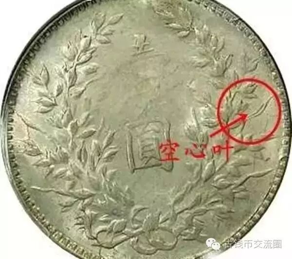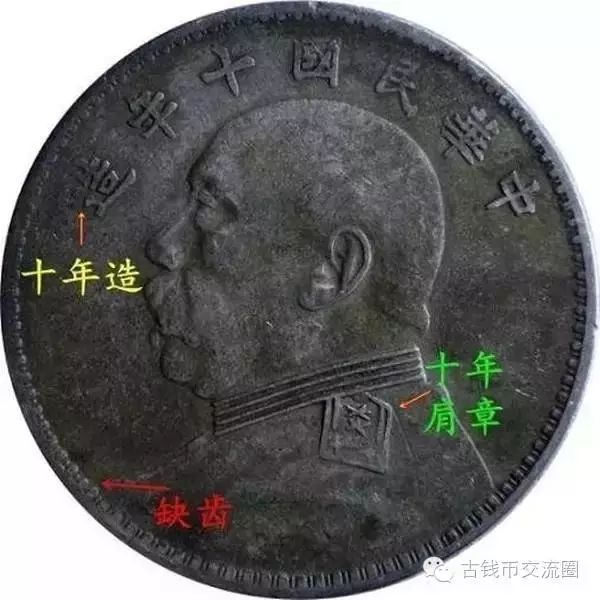 即在嘉禾图案中有'O'形暗记,在嘉禾结带处呈横'8'字形,左上方的带孔中有一极小的'O'形圆圈,而且袁像下巴前衣领未封领,肩章较宽,五星比较凸出。