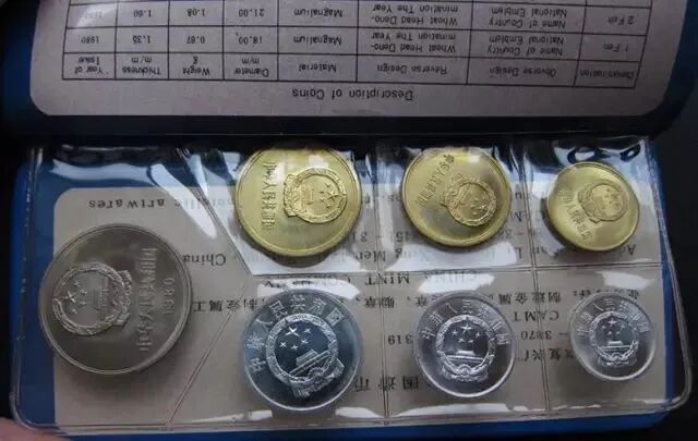 另外,沈阳造币厂还生产了1980年度的套装硬币,含1、2、5分,1、2、5角,1元七种1980年硬币,蓝色或黑色塑胶封皮包装,产量是80000套。