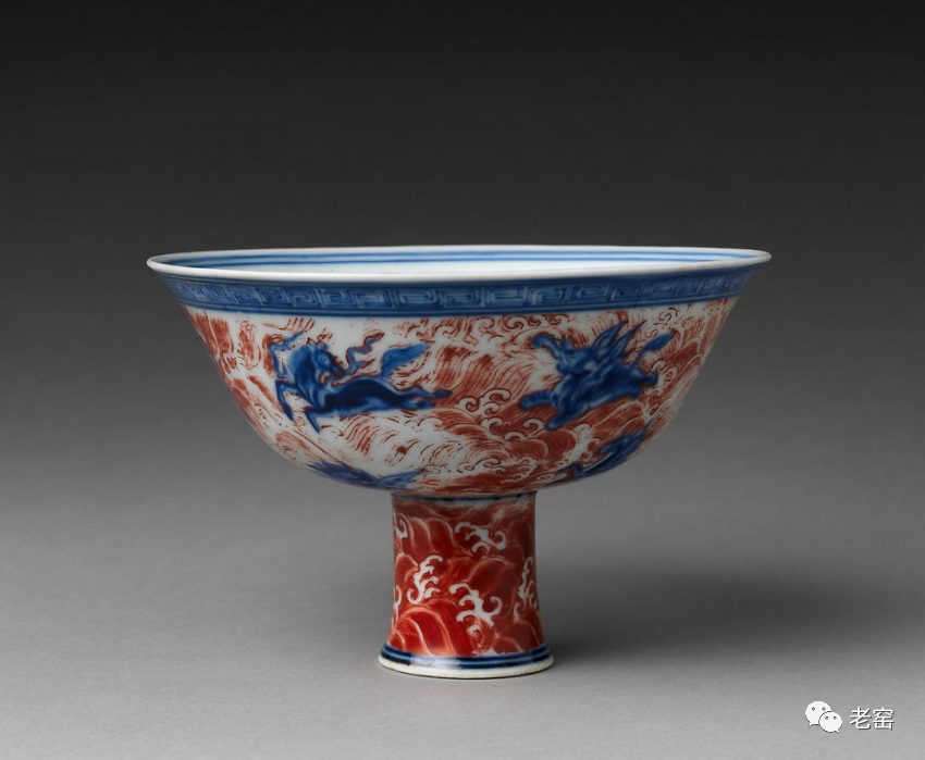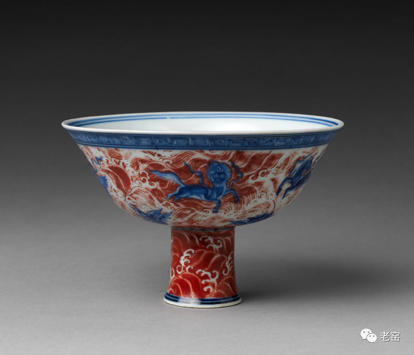 明成化 青花釉里红神兽纹高足杯(正面) 美国大都会博物馆藏