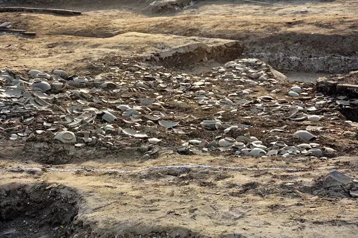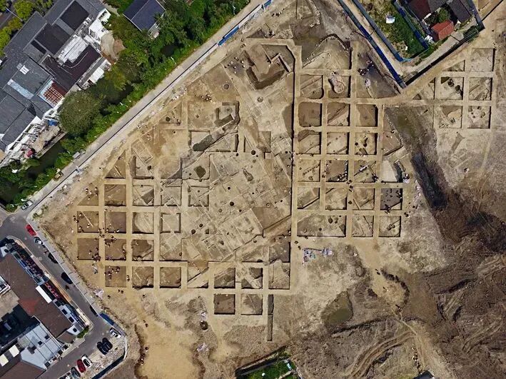 樊村泾遗址西区航拍图。古樊泾河把遗址分为东、西两个区域,文化堆积时代相同,或因功能布局而分居于河道两岸。道路、水系完整,建筑基址分布有序,说明遗址具有一定的规划布局。东发掘区房屋基址规模较大,墙体厚重,且各自有分间迹象,推测为仓储基址。西发掘区房屋建筑基址密集,有一定的规划布局,又发现有多处灶台,推测为居住生活区域。