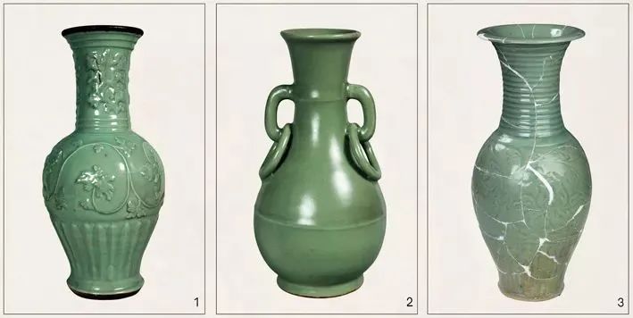 龙泉窑青瓷花瓶,南宋-元(图1)。龙泉窑青瓷青铜器形状的花瓶,明(图2)。考古发掘的15至16世纪的墓葬中,出现了不少这种款式的花瓶,可见在当时这种形状的受欢迎程度。青釉刻花牡丹纹瓶(图3)。