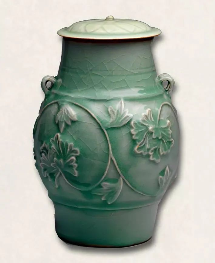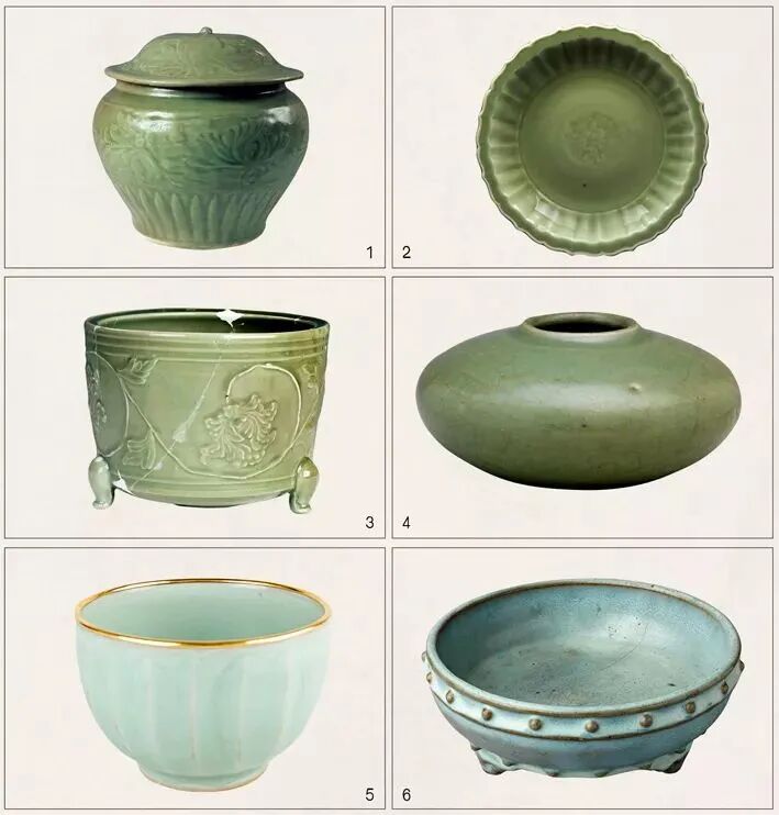 龙泉窑历经南宋时期的崛起以后,在元代迎来发展的又一个高峰,进入14世纪,龙泉窑的产品风格基本定型,以单一的青瓷为基调,变化不同的装饰方法,形成商品化的大宗生产模式。产量剧增,尤其是生活用瓷数量激增,烧造工艺更加复杂,大型器物多见。龙泉窑青瓷刻莲花纹盖坛,元(图1)。龙泉窑青瓷盘,元(图2)。青釉缠枝牡丹纹奁式炉(图3)。龙泉窑青瓷罐,宋(图4)。龙泉窑青瓷碗,宋(图5)。龙泉窑青瓷花盆,南宋-元(图6)。